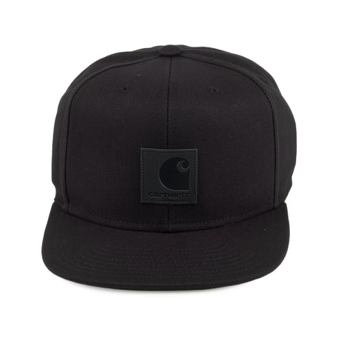 This is the Logo Snapback in black from Carhartt WIP. A faux leather Carhartt WIP logo is sewn onto the front of the crown. The brim is flat and at the back is an adjustable snap to fit most sizes. The cap has a structured crown and eyelets for ventilation.