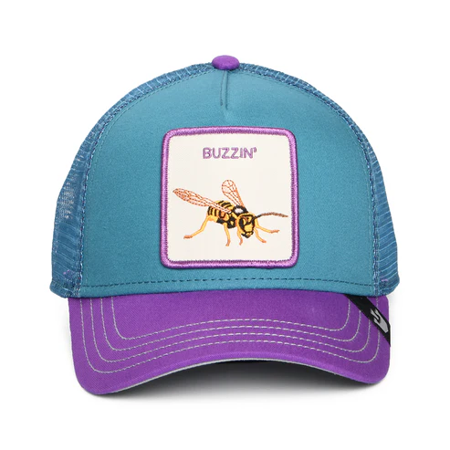 The Buzzin Bug Trucker Cap in teal-purple features a mesh back and an adjustable snap at the back for easy sizing. An embroidered Goorin label is sewn to the side of the brim. A unique patch is sewn on the structured front panel.
