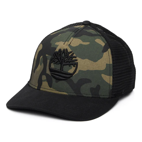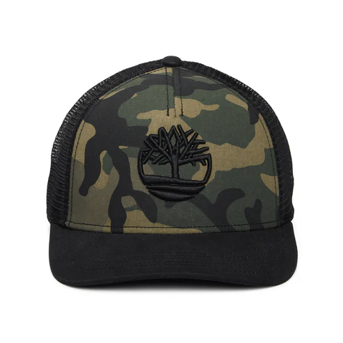 The Camo Print Trucker Cap in black-camo features a camo print structured cotton front with the Timberland logo embroidered in the middle. The mesh back has an adjustable snap for a comfortable fit. The cap comes with an anti-microbial sweatband for odour control.