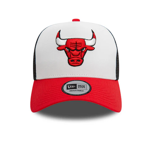 The NBA Rear Arch Chicago Bulls A-Frame Trucker Cap in white-red-black features the team logo embroidered on the structured cotton front and the New Era flag embroidered on the left side. The team name is embroidered above the adjustable snap and the NBA logo is on its left.