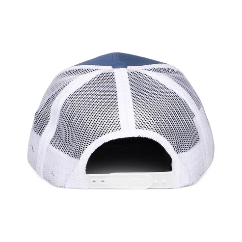Here is the Crest NetPlus MP Trucker Cap in dark denim-white. The Brixton Crossover collection blends function, sustainability and classic Brixton styling. The structured front panels and visor are made of organic cotton while the mesh back is made of polyester. The brim of the cap is made of Bureo’s 100% recycled fish nets and the sweatband is moisture wicking. There is a Brixton patch sewn on the front of the cap while an adjustable snap at the back ensures a comfortable fit.