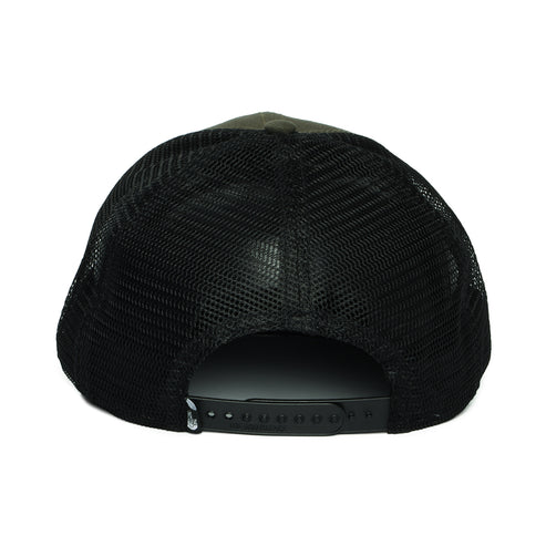 The Embroidered Mudder Recycled Trucker Cap in olive has a structured front and recycled polyester mesh back. A The North Face landscape embroidery is on the structured front. An adjustable snap at the back helps you find the perfect fit.