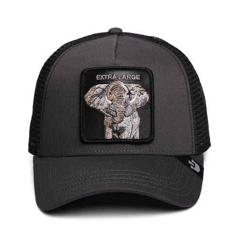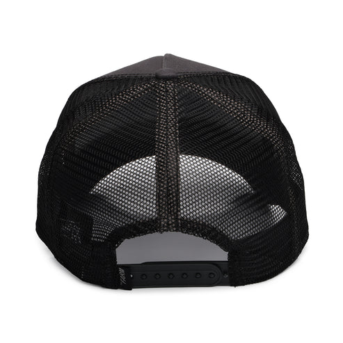 The Extra Large Trucker Cap in grey features a mesh back and an adjustable snap at the back for easy sizing. An embroidered Goorin label is sewn to the side of the brim. A unique patch is sewn on the structured front panel.