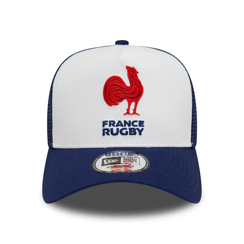 The French Federation of Rugby A-Frame Trucker Cap in white-blue features a structured cotton front with a French Federation of Rugby embroidery in the middle. The New Era flag is embroidered on the side of the cap. There is an adjustable snap at the back of the cap for a great fit.